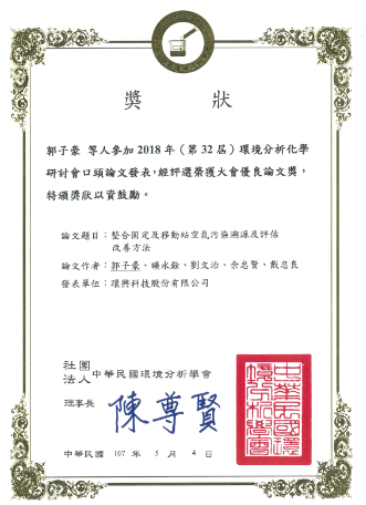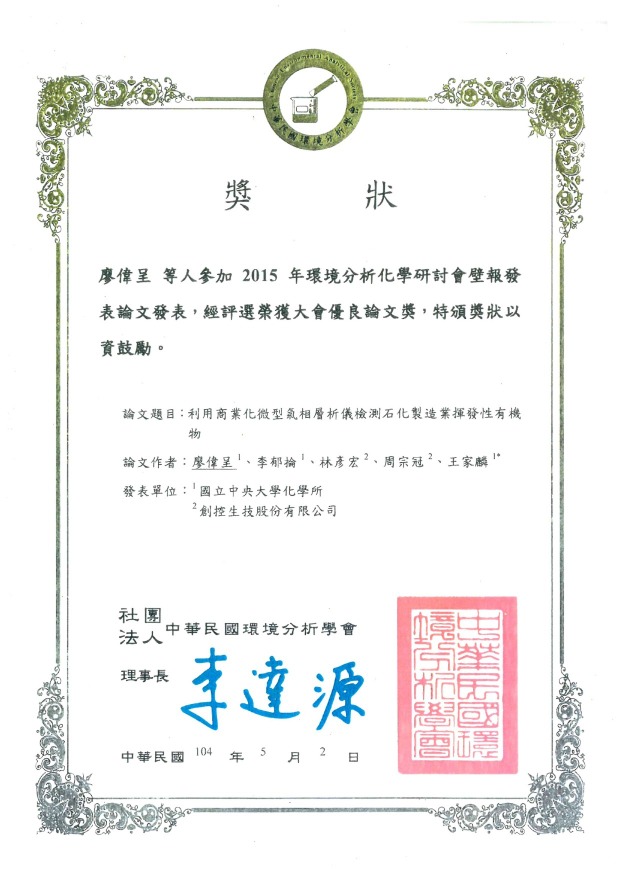 Outstanding Thesis Certificate presented by the Chinese Environmental Analytical Society