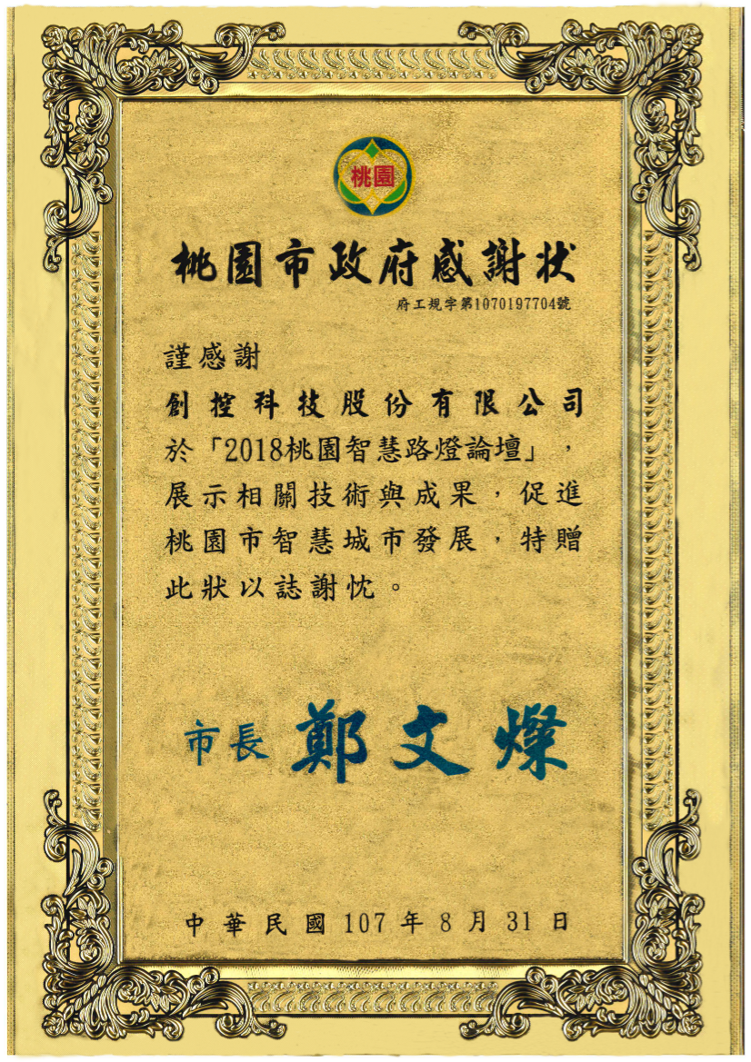 Certificate of Appreciation received during the Taoyuan Smart Street Lights Forum