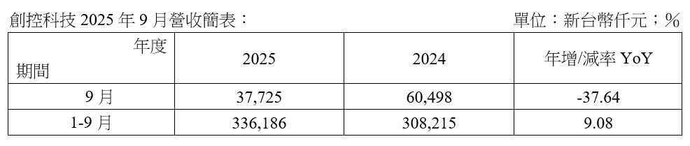 創控科技2025年9月營收報告